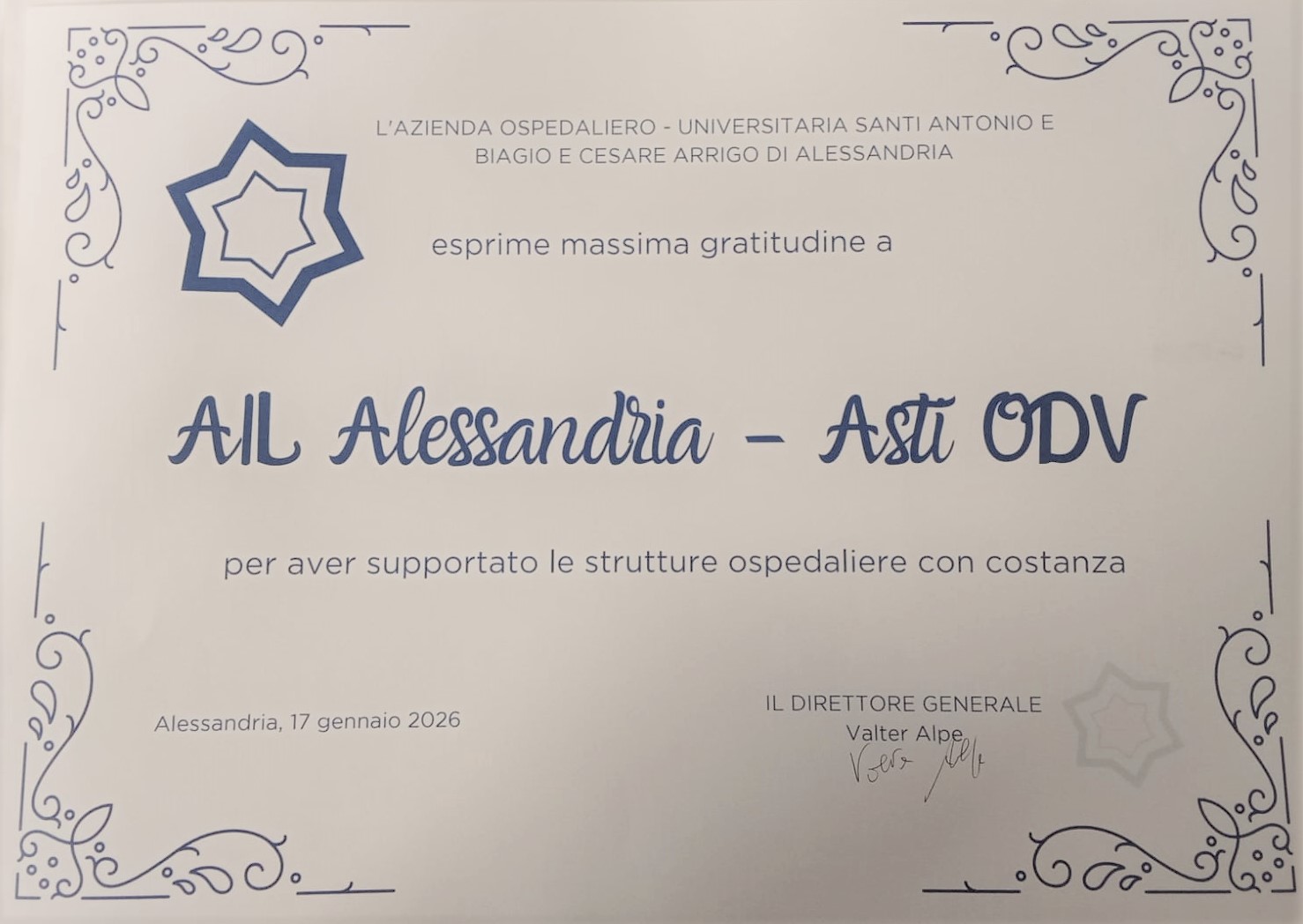 Grazie all’Azienda Ospedaliero-Universitaria di Alessandria per questo riconoscimento e a tutti i nostri volontari, i sostenitori e le persone che credono nel nostro impegno e rendono possibile il nostro lavoro, ogni giorno. 🥰❤️