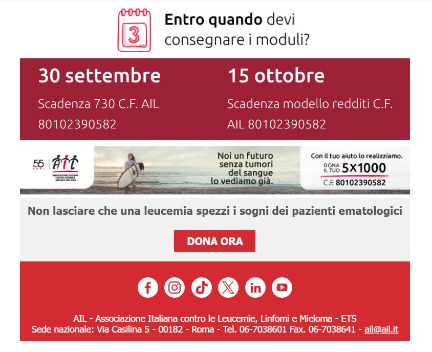 Scegli di sostenere AIL, quando presenti i modelli per la dichiarazione dei redditi (730, Certificazione Unica, Redditi Ex Unico) puoi mettere una firma e il codice fiscale di AIL 80102390582 nello spazio “Sostegno degli enti del terzo settore iscritti nel RUNTS…” oppure “Finanziamento della Ricerca e dell’Università”